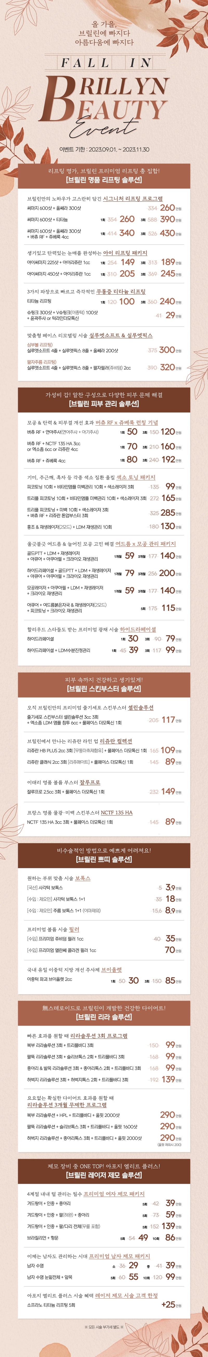 이벤트기간 : 2023-09-01 ~ 2023-11-30 브릴린클리닉 가을 이벤트 올 가을, 브릴린에 빠지다. 아름다움에 빠지다. 페이지 정보 작성자 브릴린클리닉 댓글 0건 조회 4,462회 목록 종료 본문 목록 댓글 0 댓글목록 등록된 댓글이 없습니다.